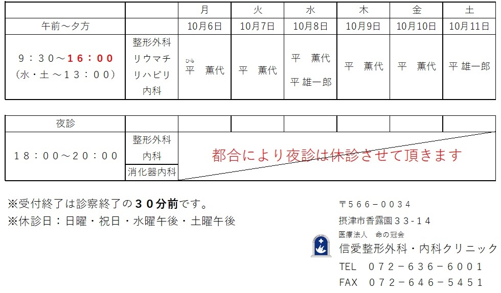 10月6日(月)~10月10日(金)の夜診は、都合のより休診とさせていただきます。