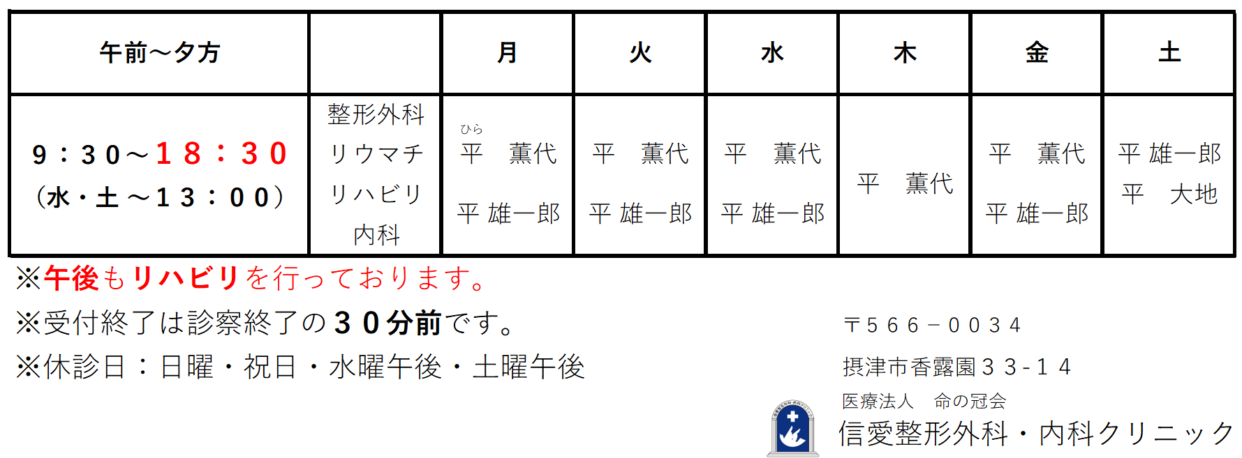 摂津市摂津市駅の整形外科・リウマチ科・リハビリテーション科・内科|信愛整形外科・内科クリニック